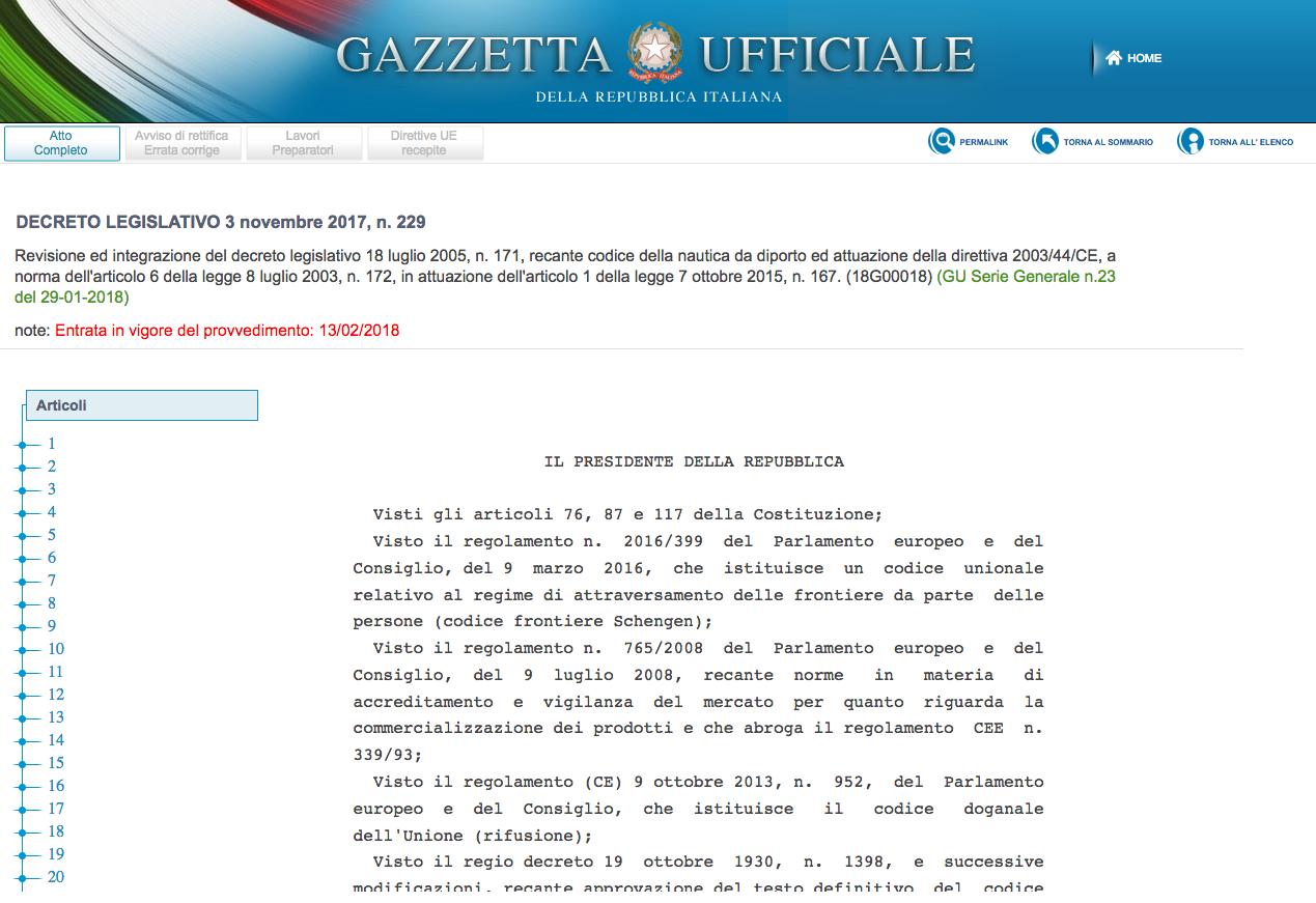 E’ stato pubblicato sulla Gazzetta Ufficiale della Repubblica Italiana il Decreto Legislativo 3 novembre 2017, n. 229, di riforma del Codice della Nautica che entrerà quindi in vigore tra 15 giorni, il 13 febbraio prossimo.