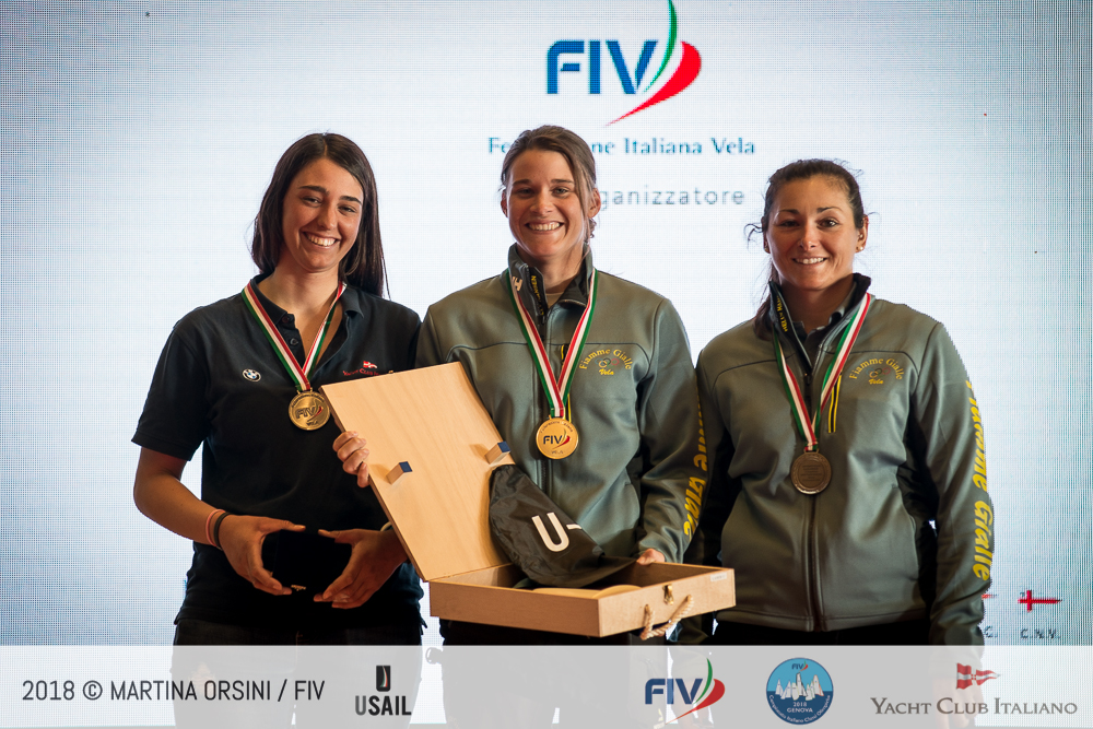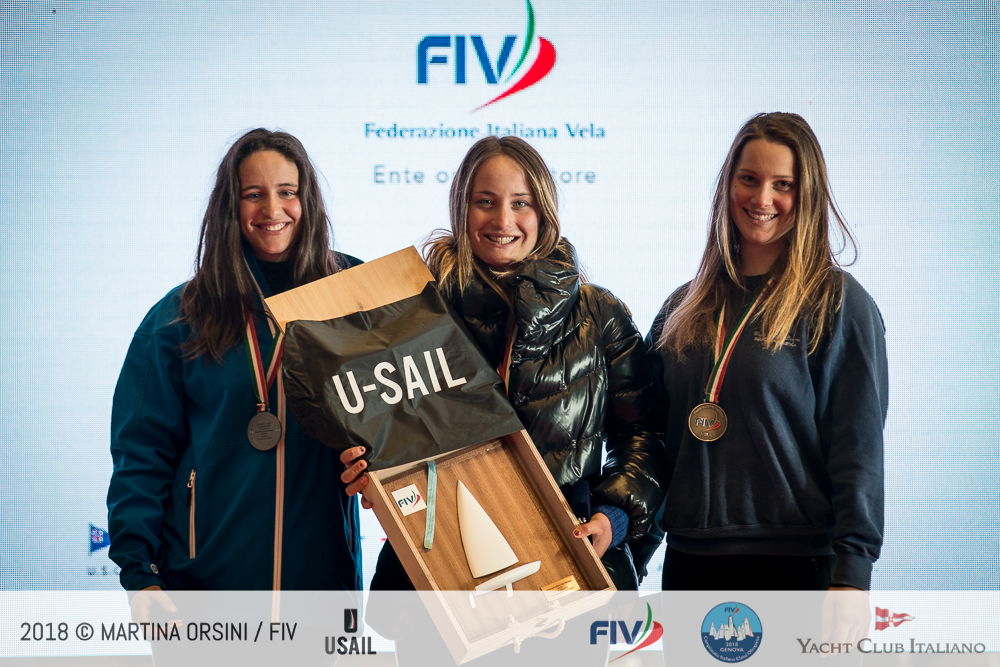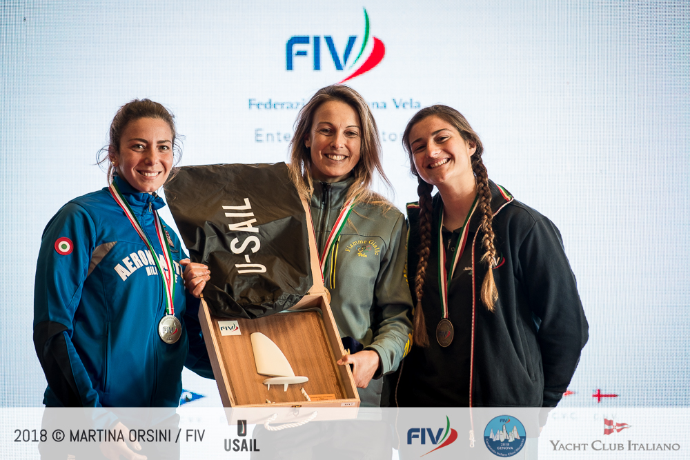 Vince il titolo nell’RS:X femminile ed è quindi Campionessa Italiana Flavia Tartaglini (SV Guardia di Finanza), sesta in generale nonostante la sua superficie velica e lunghezza della pinna siano ridotte rispetto ai ragazzi; medaglia d’argento a Veronica Fanciulli (CS Aeronautica Militare) e bronzo a Lerisen Di Leo (LNI Ostia), rispettivamente ottava e quindicesima overall.