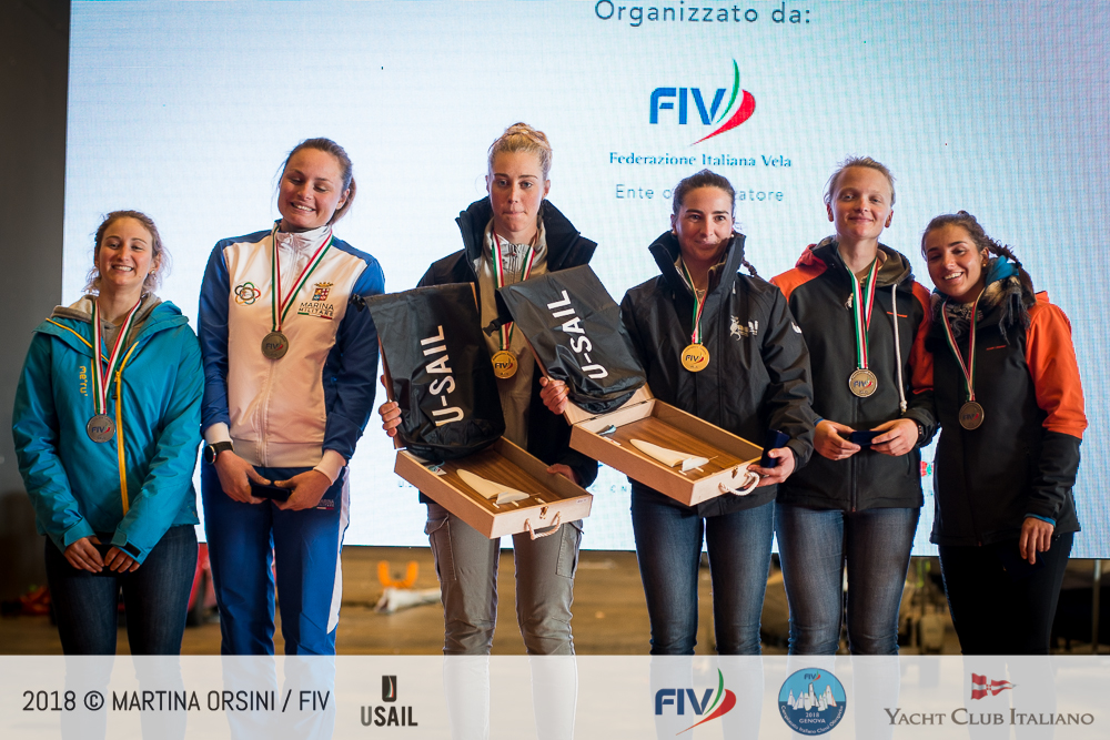 Le prime tre ragazze della classe 470 sono racchiuse in soli tre punti: vincono il titolo Italiano Bendetta Di Salle e Alessandra Dubbini (YC Italiano), terze in classifica generale con due prove vinte su sette, medaglia d’argento all’altro equipaggio femminile del circolo ospitante, Ilaria Paternoster e Bianca Caruso (YC Italiano), e bronzo a Elena Berta e Sveva Carraro (CS Aeronautica Militare) quinte in generale. Di Salle e Dubbini sono anche Campionesse Italiane Juniores.