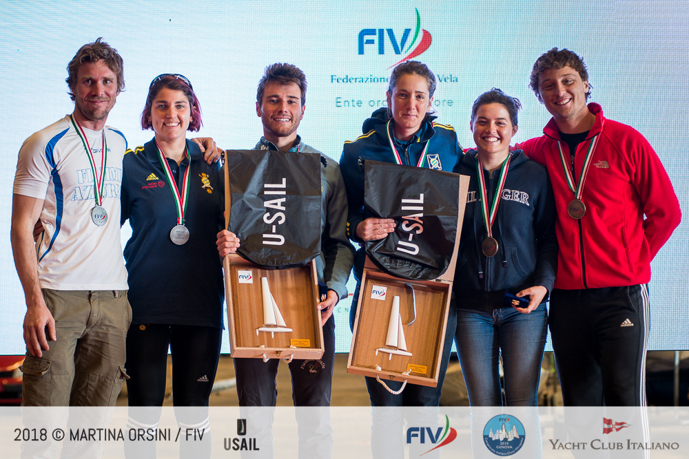 Ruggero Tita e Caterina Banti (SV Guardia di Finanza/CC Aniene) sono Campioni Italiani della classe Nacra 17 con 5 prove vinte su 8 disputate, confermando il loro stato di forma e l’affinità creata tra timoniere e prodiere; medaglia d’argento a Vittorio Bissaro e Maelle Frascari (GS Fiamme Azzurre/CC Aniene) e bronzo a Gianluigi Ugolini e Maria Giubilei (Compagnia della Vela Roma/CV Ventotene). Tita era già Campione Italiano 2017, ma nella classe 49er.