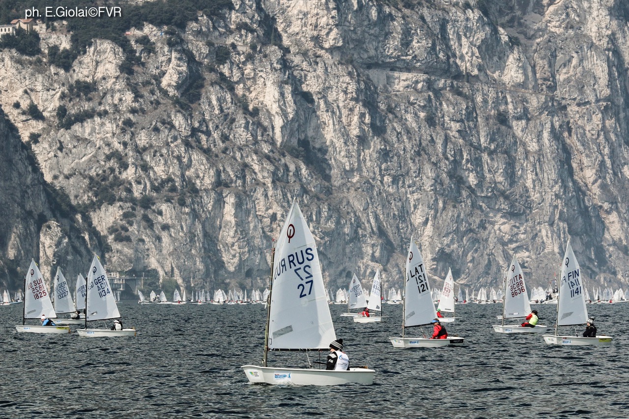 Ancora tempo perturbato sul Garda Trentino per questa Pasqua che non ha risparmiato la pioggia sul 36° Meeting del Garda Optimist, evento internazionale dedicato alla vela giovanile e in particolare della classe Optimist, con 1347 partecipanti provenienti da 33 nazioni. Ma il tempo non ha scoraggiato i giovanissimi velisti dai 9 ai 15 anni, che con pazienza hanno atteso anche oggi l’arrivo del vento sotto la pioggia: attesa premiata da una provvidenziale “ora”, vento da sud arrivato nel primo pomeriggio, che ha permesso di far partire le varie batterie che via via si sono susseguite, riuscendo a concludere due regate per ciascuna categoria, tranne un paio di batterie juniores in regata 4.