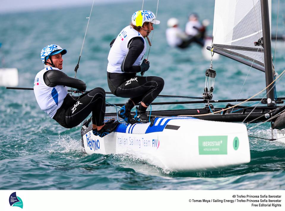 E’ dura la battaglia per la testa della classifica Nacra 17, con i nostri Ruggero Tita e Caterina Banti (SV Guardia di Finanza/CC Aniene) che lasciano passare il britannico Campione del Mondo Ben Saxton con Nicola Boniface per soli due punti, 6, 1 e 3 i loro risultati di oggi, l’onda di oggi non è la loro condizione preferita. Dietro di loro di 7 punti gli spagnoli Echavarri/Pacheco. Lorenzo Bressani e Cecilia Zorzi (CC Aniene/Marina Militare) risalgono la classifica con i parziali 8,8,2 e sono alle porte dei top10 in undicesima posizione.