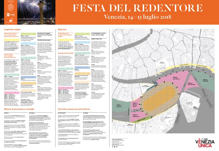 - Dopo le ore 21.00 è vietato l’attraversamento dell’Area di Rispetto dei Fuochi. I natanti in arrivo dal ponte votivo potranno posizionarsi solo nelle aree di competenza a questo limitrofe, così come quelli in arrivo dal Canal Grande e dal canale di San Marco