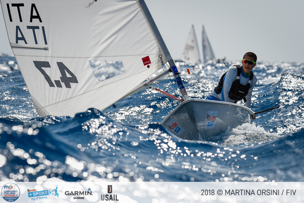 La giornata a Viareggio, dove sono in corso di svolgimento i Campionati Italiani Giovanili 2018, è partita in modo insolito, con cielo grigio, vento quasi assente e onda formata. Dopo qualche ora, e una leggera pioggia, il vento è entrato da sud-ovest inizialmente sui 6 nodi e ha toccato punte di 10-12 nodi.