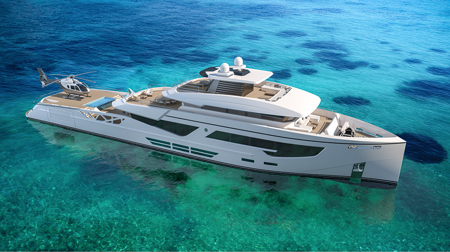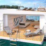 Il ragionamento alla base di questo design è la volontà di offrire diverse opzioni per sfruttare al meglio le aree vivibili esterne con un ponte poppiero di 142 mq che può essere sfruttato come helipad o grande beach club con piscina, solarium e zona living.