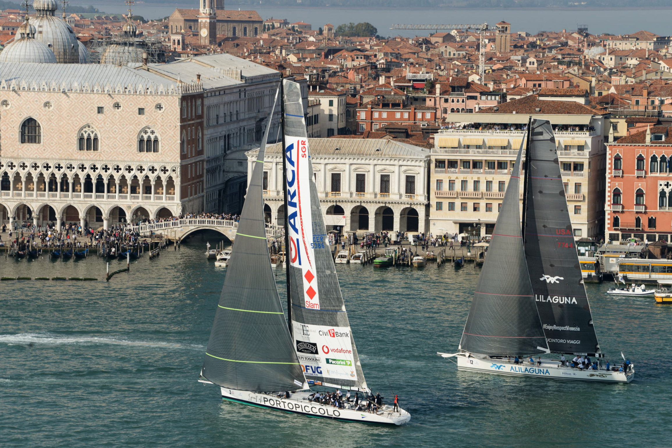Il percorso 2018 è stato particolarmente ricco di suggestioni. Dopo la partenza data dal Presidente del Comitato di Regata Gianfranco Frizzarin davanti a Punta della Salute, scandita dai getti d’acqua di un rimorchiatore durati quattro minuti, i sessanta secondi precedenti lo start sono stati evidenziati dal suggestivo alza remi della Reale Società Bucintoro. Le imbarcazioni, ormeggiate al Marina Santelena, sono partite in direzione Lido e hanno quindi girato la boa di Sant’Elena per tornare verso il bacino di San Marco, dove li attendeva una boa di disimpegno davvero inconsueta: per la prima volta nella storia dello yachting mondiale, la boa di percorso era costituita da un’auto, una Audi Q8 Mild Hybrid, ormeggiata su un pontone galleggiante che le imbarcazioni hanno girato prima di arrivare al traguardo.