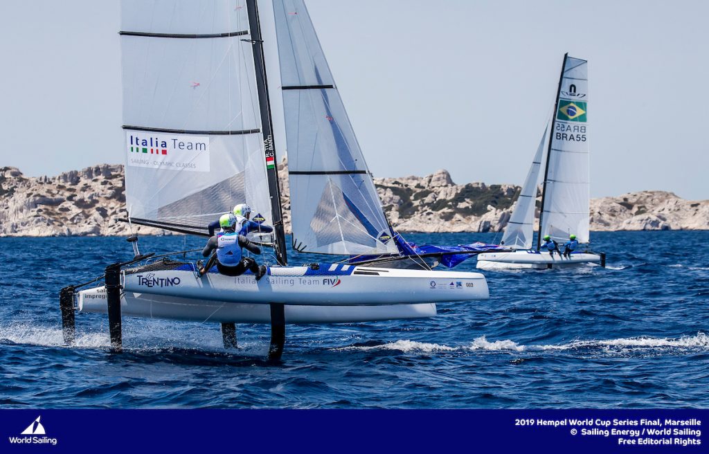 Nel catamarano olimpico foiling, troviamo in testa dopo tre prove i francesi pluricampioni del mondo, Billy Besson e Marie Riou seguiti dai britannici John Gimson e Anna Burnet e dagli azzurri Vittorio Bissaro e Maelle Frascari (GS Fiamme Azzurre/CC Aniene) con i parziali 9, 4, e 2. Ruggero Tita e Caterina Banti (SV Guardia di Finanza/CC Aniene) pagano una squalifica nella prima prova – che avrebbero chiuso in prima posizione/*in calce il link alla decisione della giuria sulla protesta – possono già scartarla, ma un secondo ed un quarto posto non li fanno andare oltre la quarta posizione provvisoria a pari punti con i terzi; Gianluigi Ugolini e Maria Giubilei (Compagnia della Vela Roma) sono 12esimi (8, 16, 12) e Lorenzo Bressani e Cecilia Zorzi (CC Aniene/Marina Militare) sono 16esimi con 14, 13 e 10.