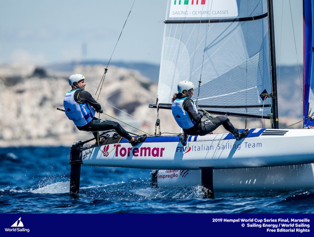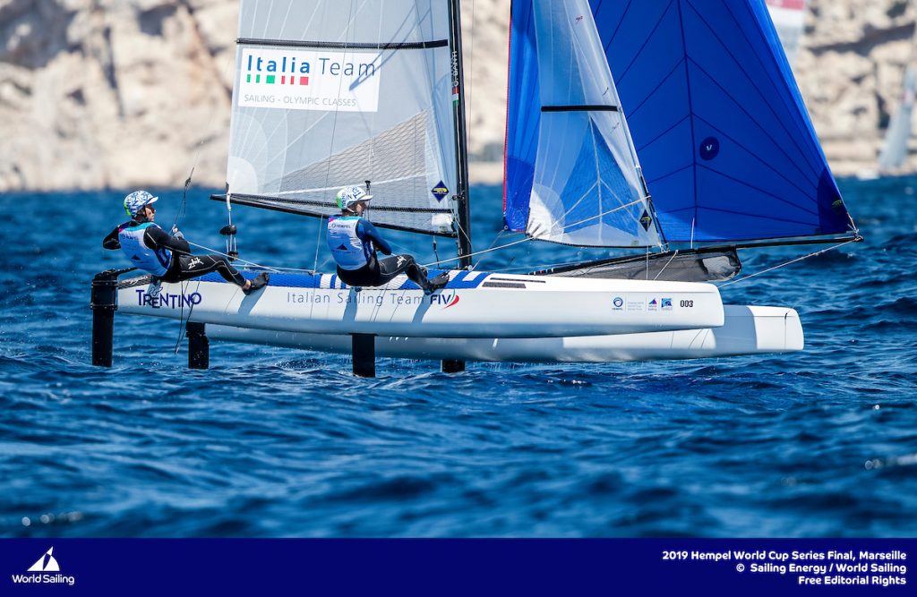 Vittorio Bissaro e Maelle Frascari (GS Fiamme Azzurre/CC Aniene) difendono la leadership nei Nacra 17 con due secondi, un primo e un quinto posto di giornata; dietro di loro i britannici John Gimson e Anna Burnet e i francesi Billy Besson e Marie Riou. Ruggero Tita e Caterina Banti (SV Guardia di Finanza/CC Aniene) conquistano due primi posti, poi registrano un quarto e un quinto e restano quarti in generale. Appaiati in decima e 11esima posizione dopo un buona giornata in acqua Gianluigi Ugolini e Maria Giubilei (Compagnia della Vela Roma) e Lorenzo Bressani e Cecilia Zorzi (CC Aniene/Marina Militare).