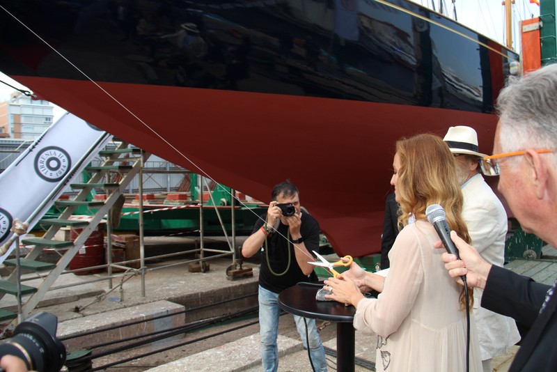 A partire dalle ore 17 sono arrivate presso la Darsena Italia del Cantiere Del Carlo a Viareggio ospiti e curiosi per assistere alla discesa in mare di Tirrenia II. La cerimonia, è proprio il caso di dirlo, è stata “diretta” da Beatrice Venezi, direttore di orchestra di fama internazionale investita del ruolo di madrina dell’evento. Presente anche un ospite d’eccezione, l’attore Alessandro Preziosi, indimenticato protagonista della fiction televisiva “Elisa di Rivombrosa”, interprete di importanti ruoli teatrali, da Shakespeare a Moliere, e di numerosi film di successo. A lui è stata affidata la lettura di un brano tratto dal “Moby Dick” di Herman Melville. Come in un vero spettacolo, nei momenti precedenti il varo, la danzatrice viareggina Eleonora Di Vita ha eseguito volteggi aerei a ritmo di musica sospesa tra i due alberi di Tirrenia II. Poi è stata la volta dei saluti e dei ringraziamenti da parte dell’armatrice e del consulente incaricato della direzione del restauro, il fiorentino Enrico ‘Chicco’ Zaccagni. Il norvegese Peter Jespersen, ex armatore di Tirrenia II durante gli anni Ottanta, ha fatto dono agli armatori della campana originale. Presente alla cerimonia anche Alberto Scuro, recente nuovo presidente dell’ASI, l’Automotoclub Storico Italiano. Dopo la benedizione di Don Luigi Pellegrini, si è svolto il tradizionale e beneaugurante rito della bottiglia infranta (al primo colpo) sullo scafo e la discesa in mare di Tirrenia II.