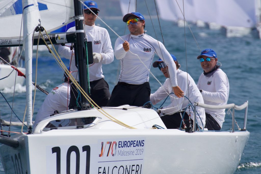 Una giornata di vento leggero inaugura le final series del Campionato Europeo J/70, con gli equipaggi italiani protagonisti nella Gold Fleet. La giornata è iniziata con una serie di richiami generali che ha costretto il Comitato di Regata a issare la bandiera nera, mietendo alcune vittime illustri come i campioni in carica di Enfant Terrible, gli inglesi di Eat, Sleep, J, Repeat e i russi di ArtTube.