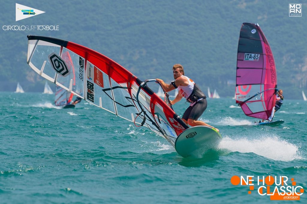 Giornata ventosa un po’ inaspettata sul Garda Trentino dopo il caldo torrido di giovedì che è proseguito tutta la notte. E infatti venerdì, nonostante la temperatura ancora molto alta, un bel vento da sud ha garantito un bell’inizio dell’edizione 2019 della RRD One Hour Classic, una delle più vecchie regate organizzate dal Circolo Surf Torbole, che si svolge in un percorso tra una sponda e l’altra del lago che i concorrenti devono percorrere in 1 ora, compiendo il maggior numero di lati.