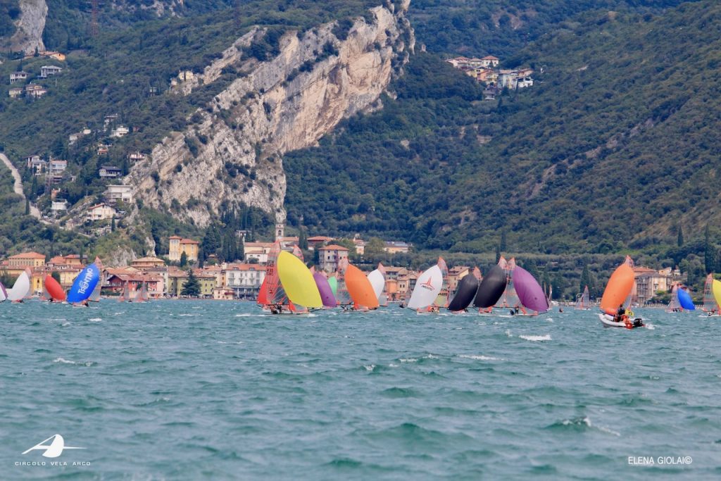 Dopo la pioggia della notte il vento è rimasto da nord per tutto il giorno, offrendo così una situazione diversa agli equipaggi in gara che finora avevano regatato sempre con il vento termico da sud. Raffiche dai 12 ai 18 nodi hanno permesso così di chiudere velocemente le due prove in programma, che hanno messo in evidenza ancora una volta gli equipaggi leader della classifica provvisoria, ma anche altri che con vento più sostenuto hanno recuperato posizioni, riuscendo a domare la barca con le improvvise raffiche di vento, caratteristiche del vento da nord dell’ALto Garda.