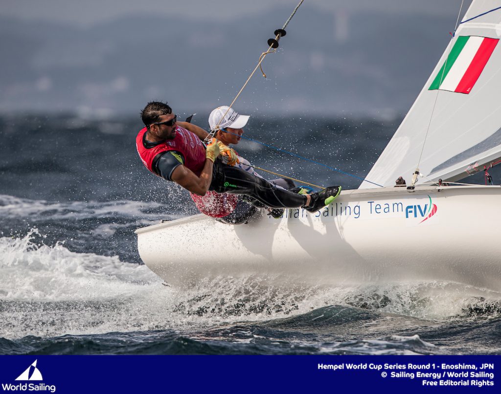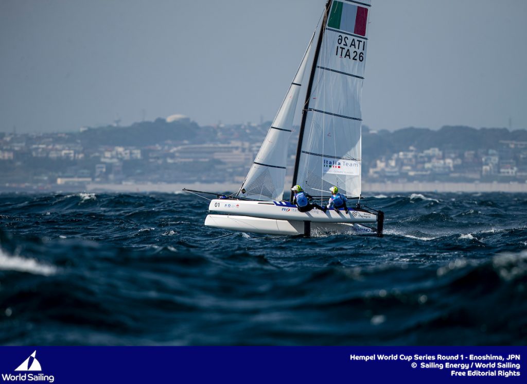 “Nella seconda prova abbiamo commesso un grosso errore sulle layline – racconta Ruggero Tita. Siamo finiti in una situazione difficile, ma fortunatamente eravamo veloci di poppa e siamo riusciti a recuperare alcune posizioni. E’ molto intenso quando sei là fuori: le onde sono corte e alte per il vento. È difficile stare sui foil.Ci piacciono le condizioni con vento e onde di Enoshima, noi piuttosto soffriamo un po’ nel vento leggero, ma finora abbiamo sempre avuto belle condizioni qui e ne siamo contenti. Oggi solo il 5-10% del nostro tempo siamo stati in grado di ‘volare’. È stato davvero difficile stare sui foil, magari facevamo 100 metri e poi cadevamo sull’acqua. Così abbiamo provato a tenere la barca in acqua, quando eravamo troppo veloci frenavamo, che è strano per una barca a vela: mettevamo uno scafo in acqua per rallentare e cercavamo di mantenere una velocità media. La barca tende ad accelerare molto ma quando sei troppo veloce ti schianti sulle onde, quindi è meglio rallentare un po’ e mantenere una velocità media di sicurezza.”