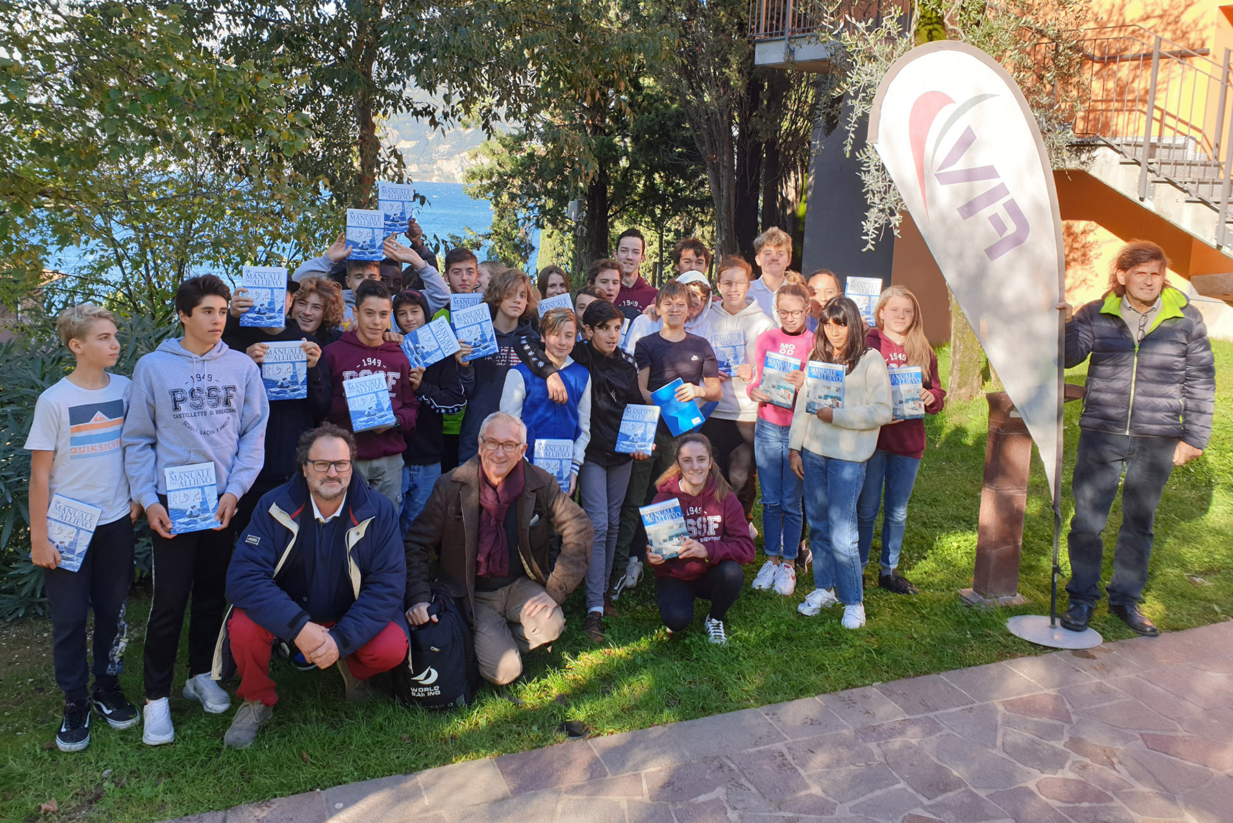Puntualmente anche quest’anno, la FIV e il Liceo Scientifico Sportivo “Sacra Famiglia “di Brenzone sul Garda (VR) hanno proceduto a consolidare il loro legame attraverso la cerimonia di consegna del Manuale dell’Allievo agli studenti di I^ liceo. L’incontro ha visto la presenza del nostro Preside Prof. Marino Battistoni, di Domenico Foschini, già presidente e attuale Consigliere Federale Nazionale con Delega alle Attività FIV del Settore Giovanile Under 19 e di Walter Cavallucci già Consigliere Federale Nazionale ed attuale membro del Council di World Saling. Durante la cerimonia di consegna del manuale è stata sottolineata la costante collaborazione fra il nostro Liceo e la Federazione: l’istituto prevede infatti, nell’arco dei cinque anni, un percorso di formazione nelle discipline veliche che preparerà i ragazzi al brevetto di Istruttore di I° livello.