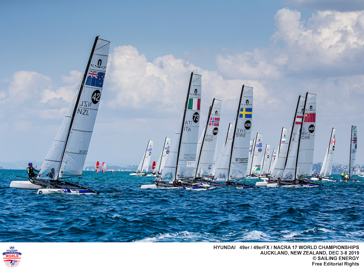 Terzo giorno del Mondiale 49er, FX e Nacra 17 ad Auckland, ancora condizioni diverse: questa volta il vento è stato medio-leggero, sempre con una accentuata instabilità nella direzione e consueta corrente con onda corta. Nei campi di regata a Nord Ovest di Auckland nel golfo di Hauraki sono state disputate tre manche per le tre batterie 49er maschili, e quattro ciascuna per le due batterie delle classi 49er FX femminili e Nacra 17 misti.