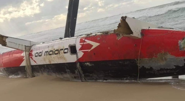 Senza più scafi laterali, lo scafo centrale, con le traverse ridotte ormai a 4 miseri monconi, si è spiaggiato spezzando il timone, come si vede dalle macabre foto. Parte della poppa è stata portata via durante qualche burrasca lungo le oltre 600 miglia percorse alla deriva dal luogo in cui Ad Maiora si è ritirato dalla regata.
