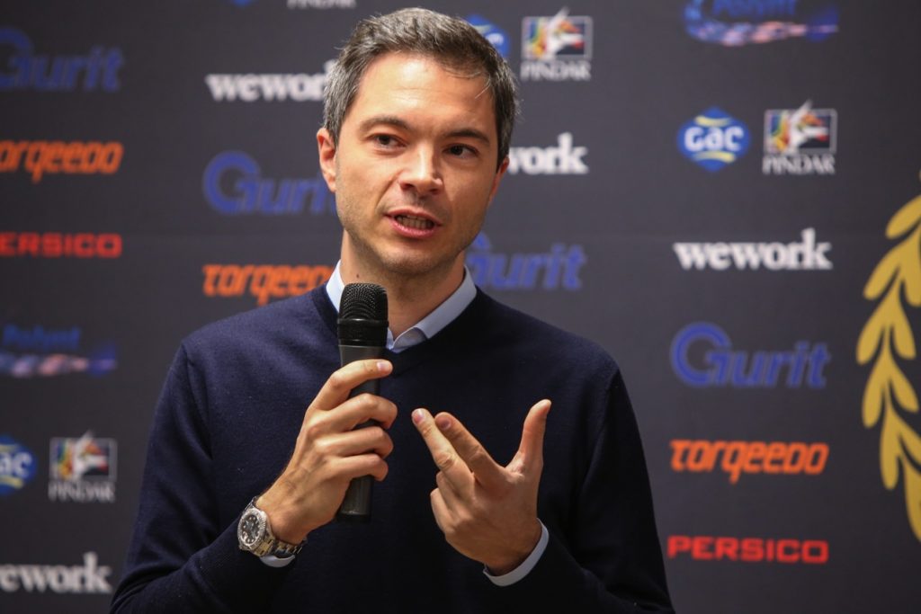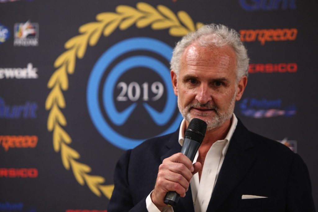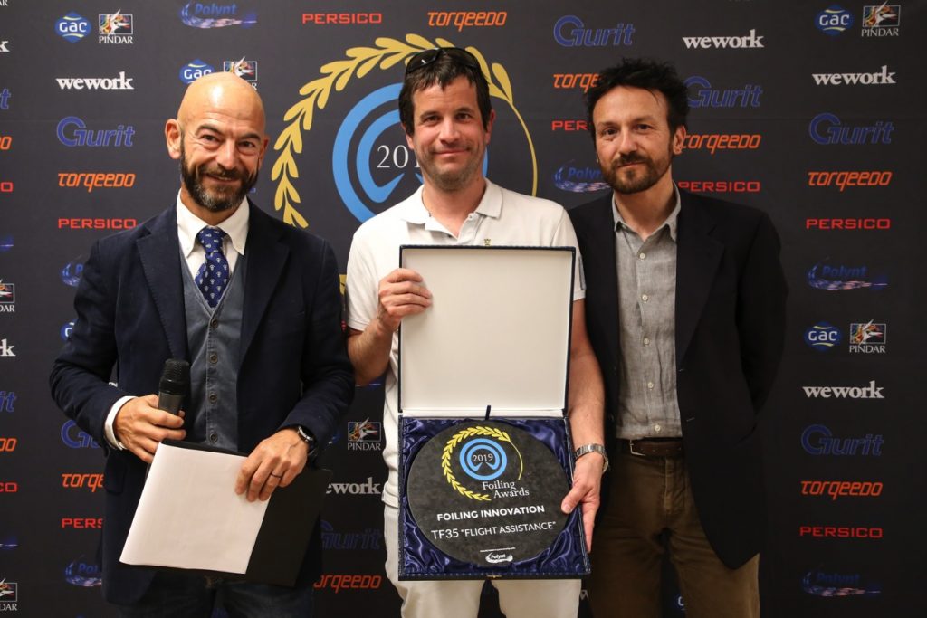 Luca Rizzotti ha premiato Bertand Favre, l’uomo dietro al concetto del TF 35, il catamarano con un innovativo e sofisticato sistema di controllo automatico dei foil tramite software.