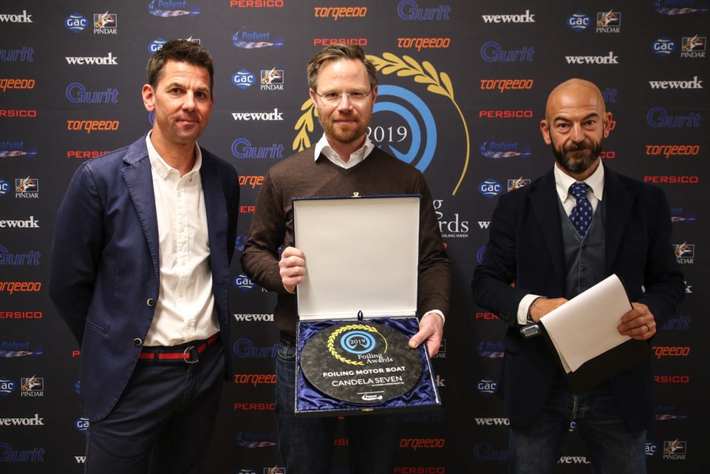 Nella categoria Foling Award Motorboat Candela 7.5, raffinata ed elegante barca di serie, ha sbaragliato sia i foil dei catamarani da crociera Aquila, installati su tutti i modelli del marchio sino americano, sia il prototipo del colosso francese Beneteau. Gustav Hasselskog (CEO and founder Candela) has been awarded by Oliver Gluck.