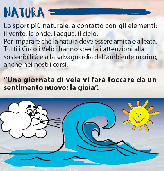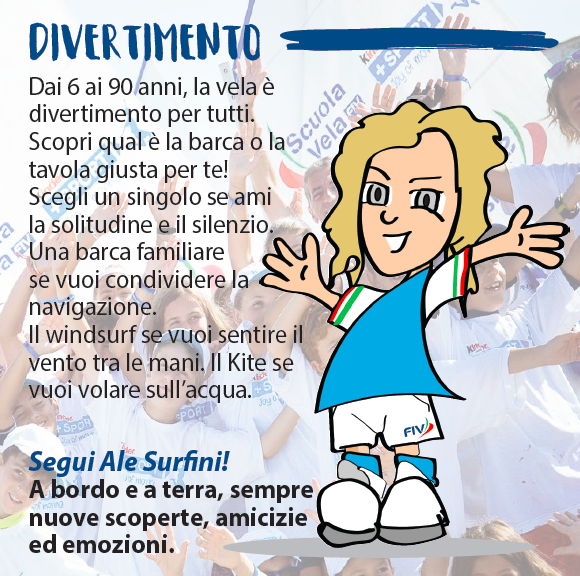 I MESSAGGI CHIAVE DELLA SCUOLA VELA FIV – La Federvela punta a mantenere e aumentare i numeri delle stagioni passate, con oltre 40.000 allievi ai corsi di vela federali. Sono in partenza per i Circoli Velici e le Scuole Vela FIV i Kit del Progetto “Ritrova la Bussola”, tra cui un flyer che sotto la guida del personaggio “Ale Surfini” (il fumetto della supercampionessa olimpica Alessandra Sensini) contiene i cinque messaggi rivolti al pubblico e che identificano i valori della Vela. Eccoli.