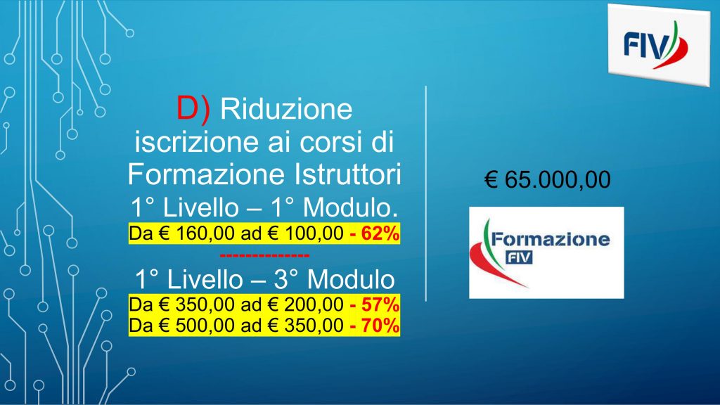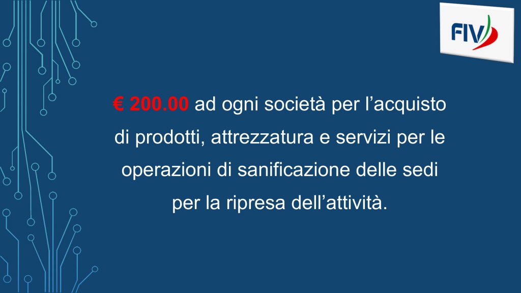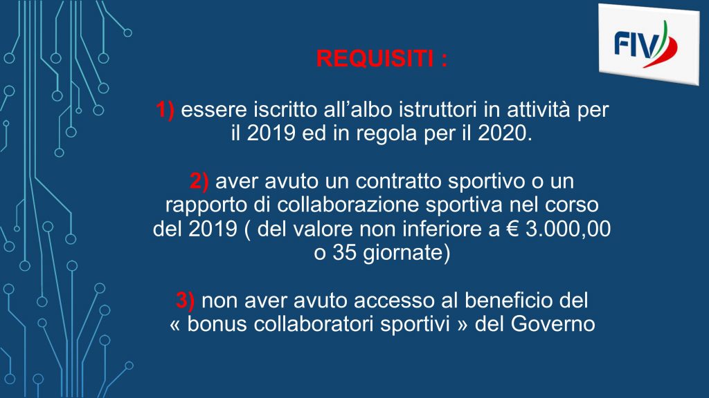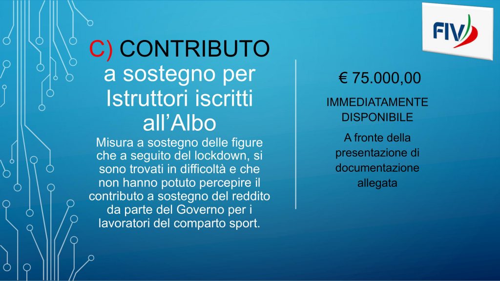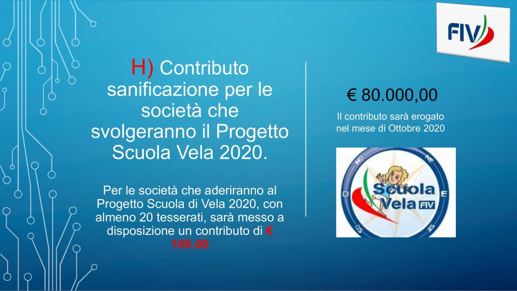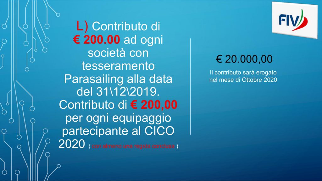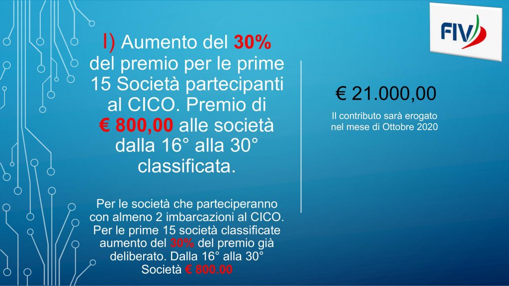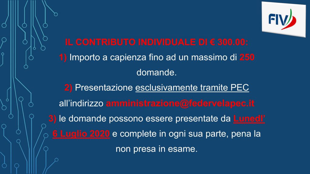 In ulteriore aggiunta, il Consiglio FIV ha stanziato altri 75mila Euro per aiuti a Istruttori FIV che non hanno beneficiato dei previsti contributi ai collaboratori sportivi erogati nelle scorse settimane, a fronte di una documentazione attestante i seguenti requisiti: 1) Iscrizione all’albo istruttori in attività per il 2019 e in regola per il 2020; 2) Titolarità di un contratto sportivo o un rapporto di collaborazione sportiva nel corso del 2019 (del valore non inferiore a € 3.000 o 35 giornate); 3) mancato accesso al beneficio del “bonus collaboratori sportivi” del Governo. La domanda e la documentazione si possono presentare online dal 6 luglio tramite il sito federvela.it. L’importo erogato sarà di € 300 fino a un massimo di 250 domande.