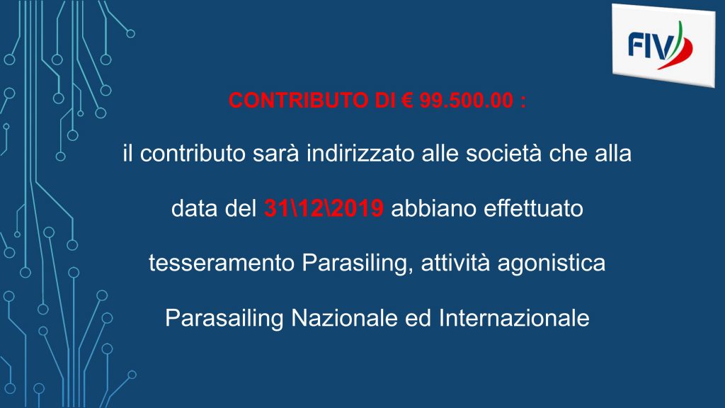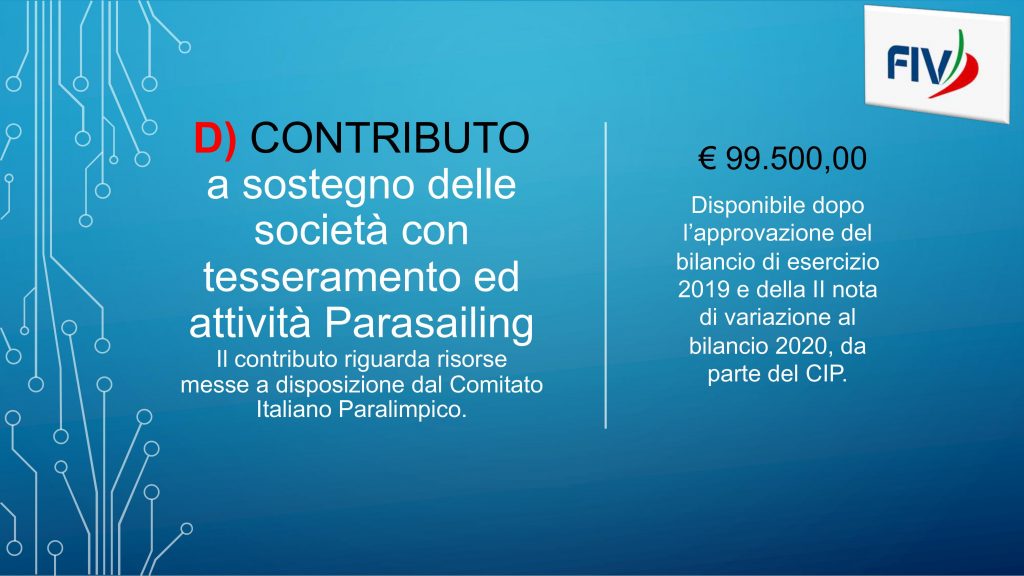 Altra voce deliberata dal Consiglio riguarda interventi a favore delle società impegnate nelle attività Paralimpiche della vela, Parasailing, per un totale di circa € 100.000, risorse messe a disposizione dal Comitato Italiano Paralimpico, e disponibili dopo l’approvazione del bilancio di esercizio 2019 e della II nota di variazione al bilancio 2020, da parte del CIP. Il contributo sarà erogato direttamente dal CIP alle società che alla data del 31/12/2019 abbiano effettuato tesseramento Parasiling, attività agonistica Parasailing Nazionale ed Internazionale. La FIV invierà alle Società l’apposita documentazione.