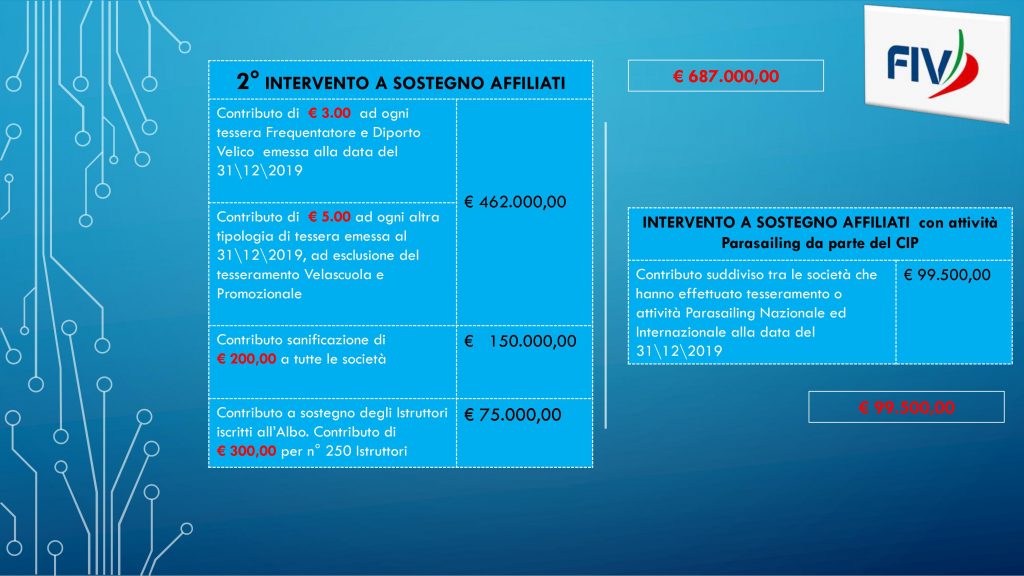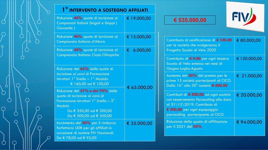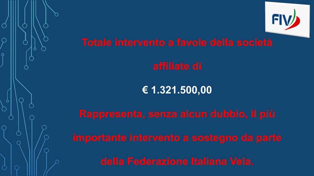 L’importo totale delle due manovre a favole della società affiliate è di € 1.321.500, e rappresenta il più importante intervento a sostegno da parte della Federazione Italiana Vela.