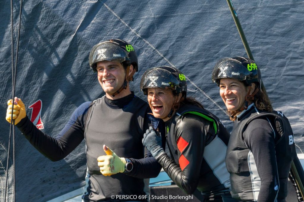 Le prove in acqua hanno visto tre equipaggi sostanzialmente ad armi pari: lo Swiss Team Tixwave, i giovanissimi olandesi del Kingdom Team Netherlands – vera rivelazione di questo event – e la coppia Conti-Micol arricchita da Simone Salvà: le due olimpioniche 2012 si sono prese una regata di rodaggio per ritrovare la grande armonia, maneggiare i foil e chiudere prime al traguardo nella metà delle run disputate. Tra Giulia Conti e il Persico 69F è già amore a prima vista: “Penso sia la barca più bella su cui abbia mai navigato – dichiarerà appena scesa a terra – più sicura del 49er, stabile, velocissima: abbiamo toccato i 23 nodi di lasco. Prima di scendere in mare stamani, con onda, avevo un po’ di preoccupazione ma poi è passata subito, c’è solo da divertirsi”.