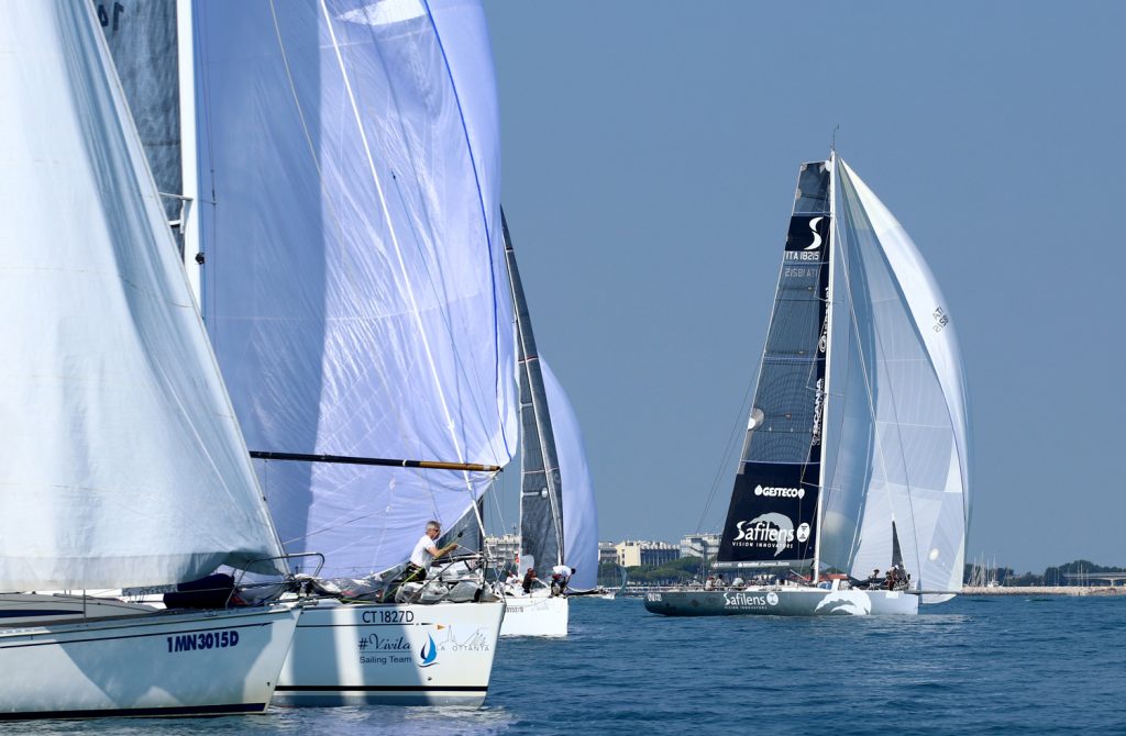 Partenza dal pin per Anywave Safilens il 63 piedi di Alberto Leghissa che ha scelto di tenersi discosto dalla flotta lasciandosi alle spalle per primo il cancello della Chiesa della Madonna dell’Angelo, in direzione boa foranea di Grado.