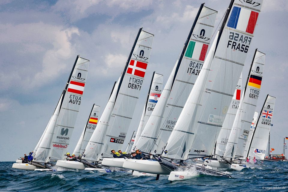 Quattro regate impegnative anche per le ragazze della deriva acrobatica, con tutti e tre gli equipagi italiani in flotta Gold. Volano in testa le tedesche Lutz e Beucke, appena davanti alle statunitensi Roble e Shea, grandi protagoniste di giornata con due primi e un secondo e alle inglesi Dobson e Tidey, tutte atlete abituate al vento forte. Le giovani azzurre Jana Germani e Giorga Bertuzzi (Sirena-FV Malcesine) che erano terze, non sono crollate e hanno retto il confronto, superando anche un brutto inizio di giornata senza farsi condizionare e restando regolari (26-7-7-7), e adesso sono al 7° in generale a 13 punti dal podio. Per loro Kiel resta molto positiva. Appena fuori dalla top-ten (11°) Alexandra Stalder e Silvia Speri (CN Bardolino-FV Peschiera) (14-11-6-10 di giornata). Si difendono anche Carlotta Omari e Matilda Distefano (Fiamme Gialle-Triestina Vela), specialiste con vento leggero, che sono al 18° posto (13-12-26-13).