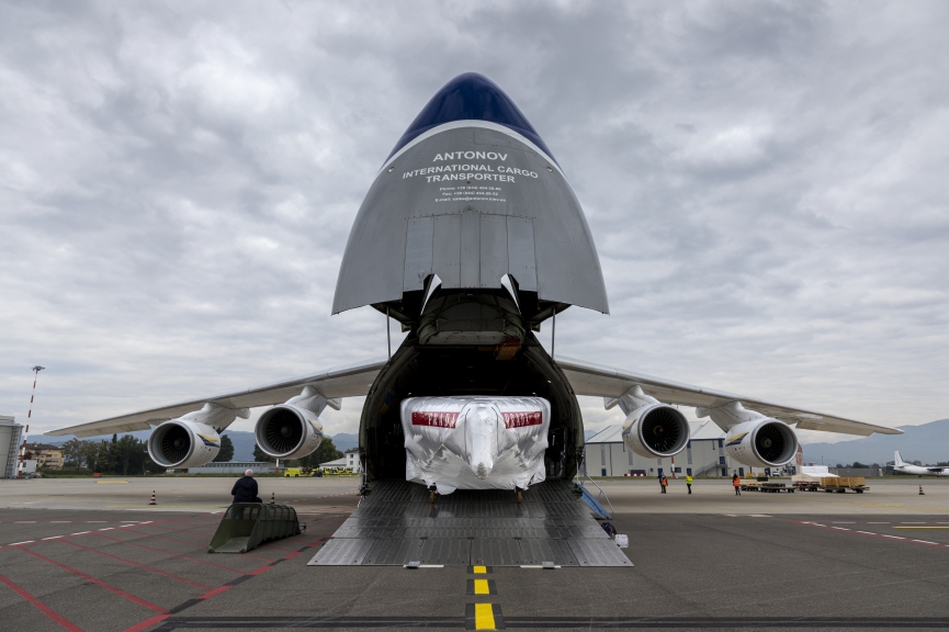 Barca 2, costruita presso il cantiere Persico Marine di Bergamo, distante poco più di 10 km dall’aeroporto, è stata trasferita con un trasporto eccezionale ed imbarcata su un Antonov 124-100, uno degli aerei cargo più grandi in circolazione.