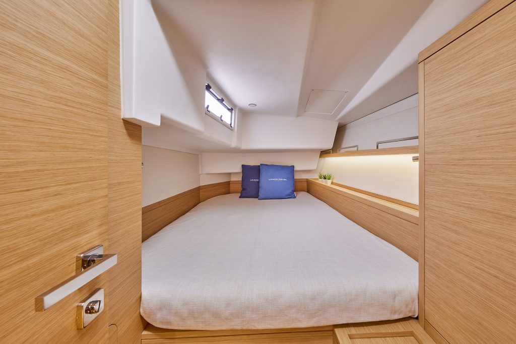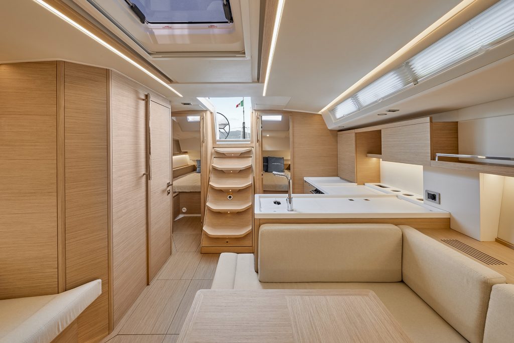 Per quanto riguarda il layout degli interni, che prevede tre cabine e due bagni (entrambi con box doccia separato), è da notare la sorprendente vivibilità degli spazi che convive con uno scafo dal carattere sportivo. I volumi percepiti sono davvero notevoli. Gli spazi sottocoperta godono di un generoso baglio che regala ampi e comodi volumi: la cucina a L è posizionata sulla sinistra, la dinette è composta da un comodo divano a U con al centro un tavolo da pranzo che può ospitare fino a otto persone e sulla destra da un divano a murata da tre posti con tavolo da carteggio posizionato contro la paratia di prua. La cabina armatoriale, con comodo letto matrimoniale, divanetto e bagno dedicato, ha dimensioni davvero generose per uno scafo di 44 piedi dal carattere sportivo. A rendere ancora più confortevoli gli spazi interni è la notevole luminosità naturale che entra attraverso le varie finestrature a scafo e sulla coperta.