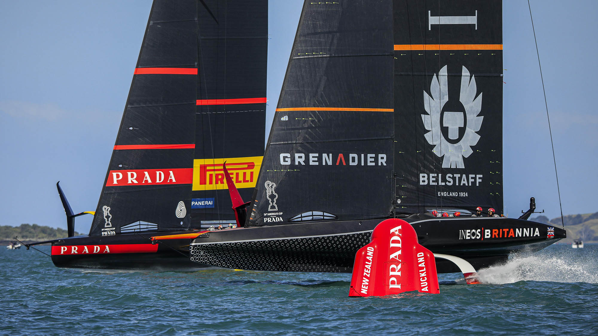 La prima virata è arrivata dalla squadra di Sir Ben Ainslie, gli italiani hanno seguito l’esempio per coprirli. Pochi minuti dopo INEOS TEAM UK ha virato di nuovo a dritta, Luna Rossa Prada Pirelli ha seguito per mantenere la loro copertura e così il percorso è continuato fino alla boa. Ogni volta gli italiani allungavano di più la distanza e giravano il primo cancello con 30 secondi di vantaggio.