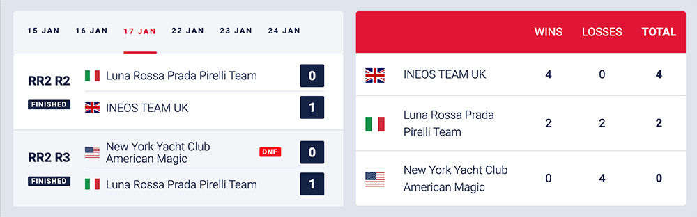 Il week end si chiude con tutti i due round robin in programma conclusi. Ineos team uk imbattuto è i in testa alla classifica, seguito da Luna Rossa Prada Pirelli con due vittorie e due sconfitte e NYCC America Magic con nessuna vittoria.