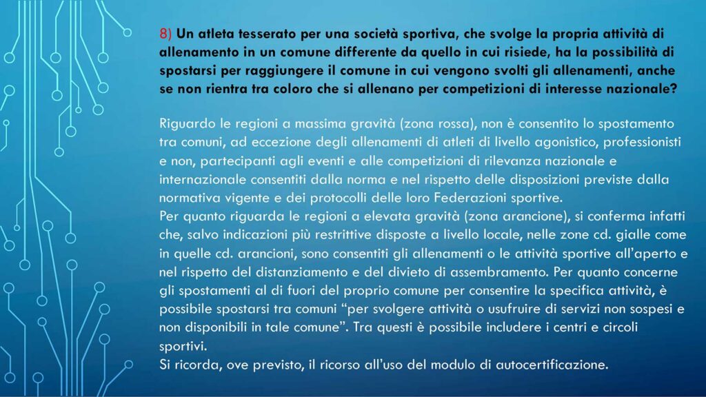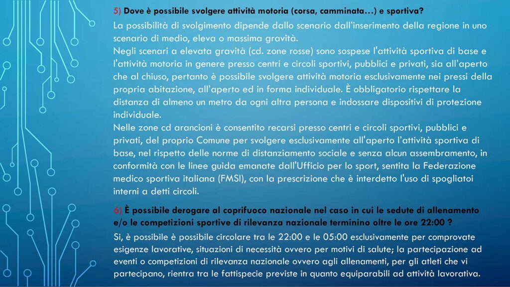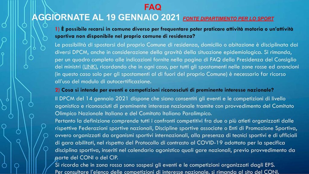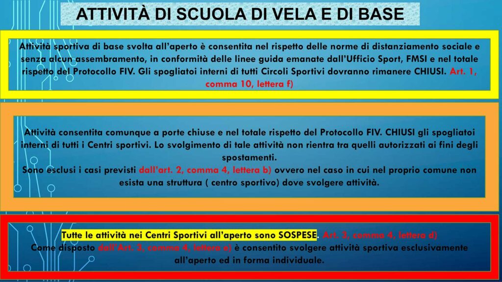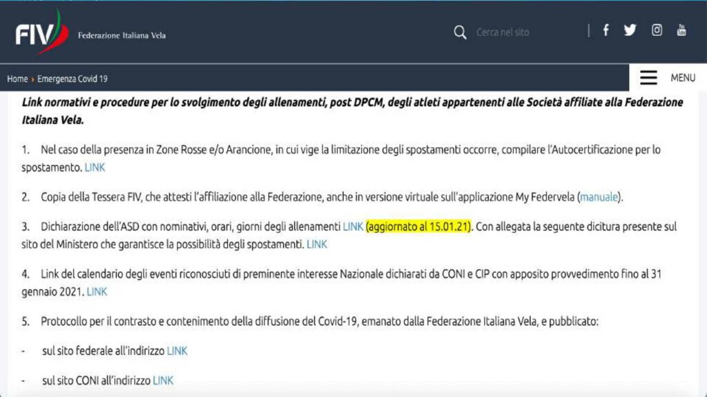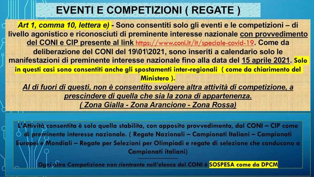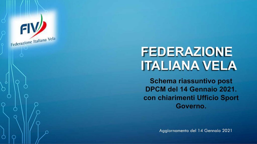 La Federazione Italiana Vela ha pubblicato lo schema riassuntivo in base al DPCM del 14 Gennaio 2021 corredato dai chiarimenti dell’Ufficio Sport Governo attinente l’attività di: allenamento, scuola vela e di base, eventi e competizioni.