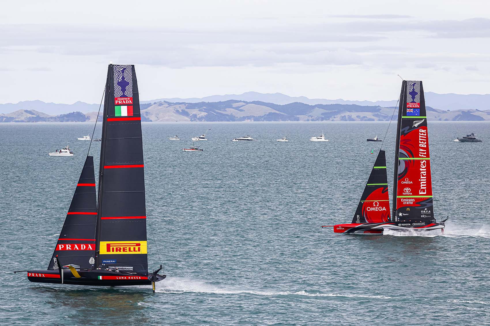 Al secondo cancello il vantaggio della barca italiana è di 4 minuti e 8 secondi. La regata sembrava ormai decisa… invece lungo la seconda bolina prima del terzo cancello è toccato alla barca italiana cadere dai foil e iniziare a navigare con difficoltà. La situazione a quel punto si ribalta: Emirates Team New Zealand riesce a decollare e buttarsi all’inseguimento mentre Luna Rossa è costretta a navigare in dislocamento. I kiwi passano a distanza dall’altro lato del campo in piena velocità trasformando quello che poteva essere un disastro in una vittoria. Quello che sembra un vantaggio incolmabile a favore degli italiani si consuma in pochi minuti. Così, mentre il direttore di regata decide di accorciare la prova a cinque lati la situazione si ribalta ed è Te Rehutai a condurre la regata senza problemi fino alla fine, chiudendo con un vantaggio di 3 minuti e 55 secondi.