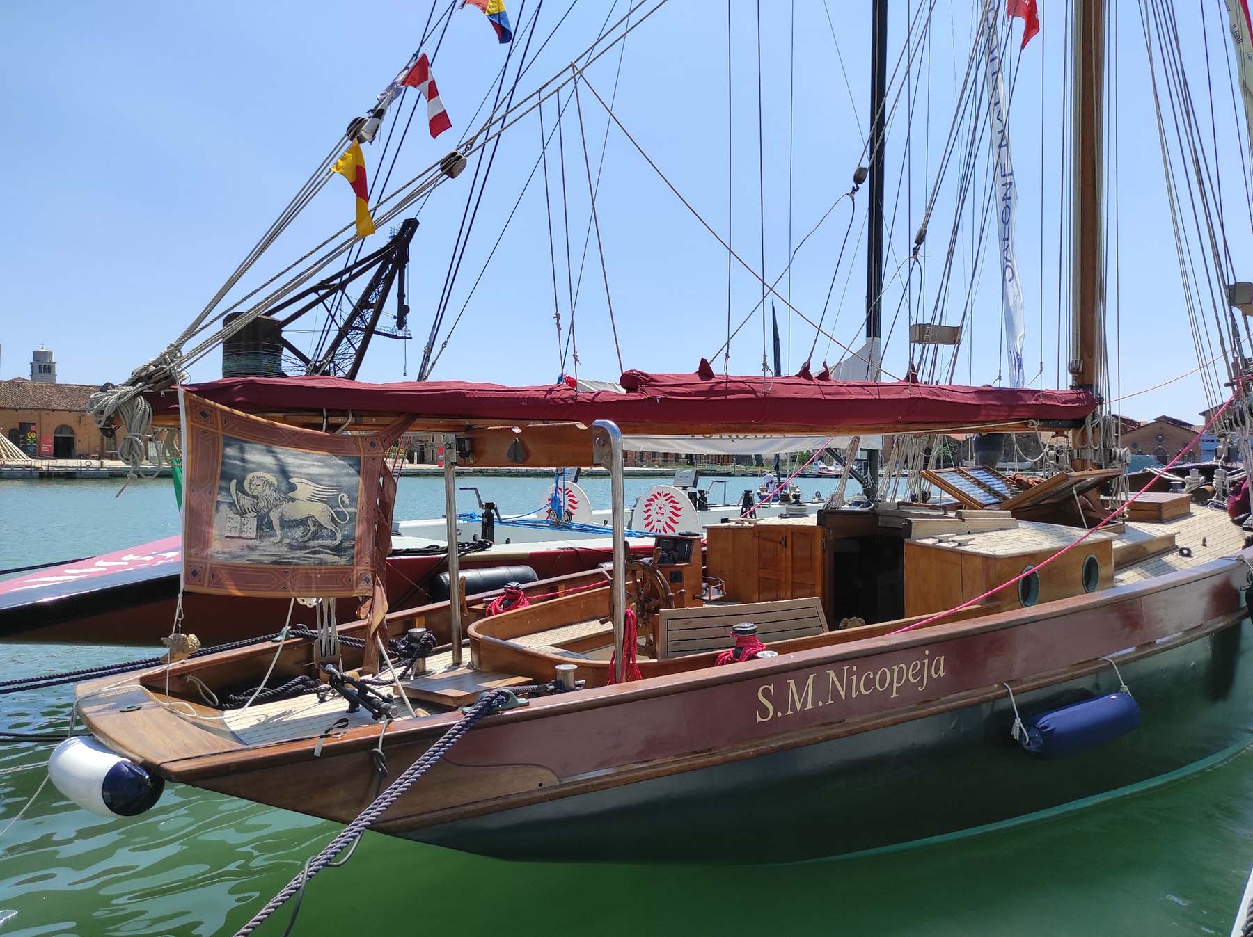 Il cantiere Casaril, che conta oltre cento anni di attività, espone in una delle darsene dell’Arsenale l’imbarcazione d’epoca in legno Nicopeja, costruita nel 1901 da cantieri Belfleur in Normandia, e restaurata con cura e dedizione dal titolare Luca Casaril. “Ci ho messo quattro anni e più di 4mila ore di lavoro – spiega – la Nicopeja è forse l’esempio più bello di quello che facciamo. Una delle maggiori problematiche che si riscontrano oggi è che di queste barche ce ne sono poche in giro perché è difficile ormai trovare appassionati di barche d’epoca, sono in controtendenza con il gusto attuale, oltre al fatto che costano di più rispetto a una barca delle stesse dimensioni in plastica”. In mostra anche un esempio dell’attenuatore d’onda che insieme al socio Claudio Berti il cantiere ha prototipato e prodotto per contrastare il moto ondoso.