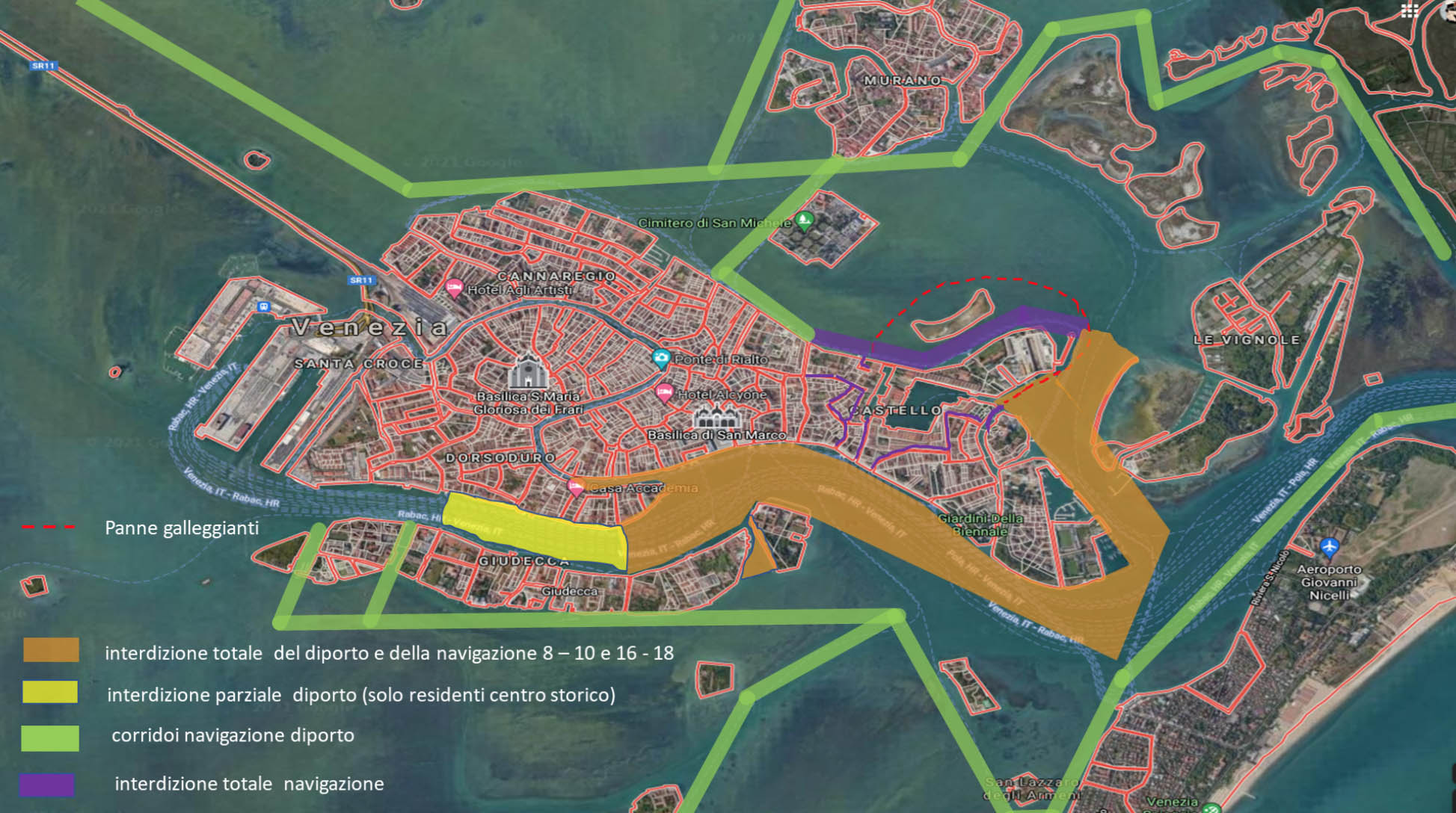 Parimenti, sarà vietata la navigazione di tutte le unità navali nella medesima area, nelle fasce orarie 08.00-10.00 e 16.00-18.00, fatto salvo il servizio pubblico di linea gestito da Actv e Alilaguna (Area arancione).