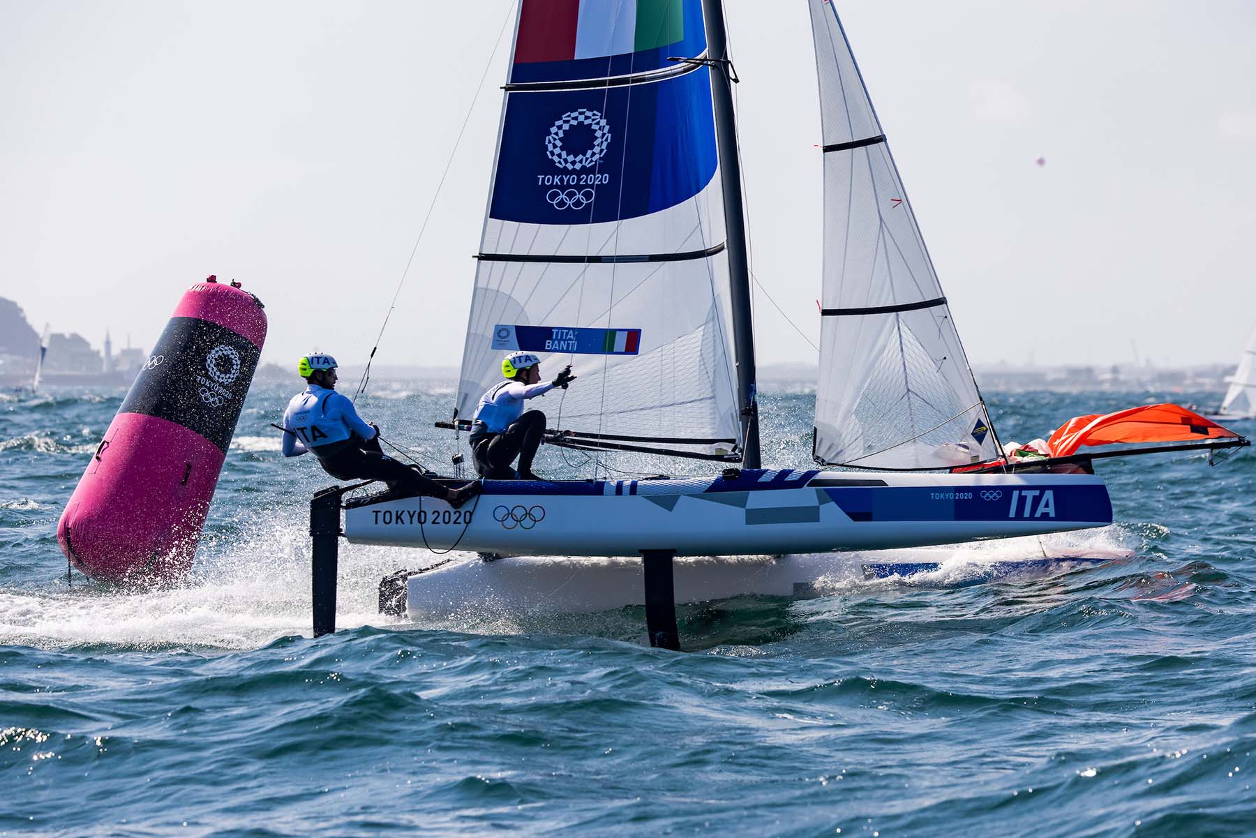 Nacra 17 – Nelle regate del mattino protagonisti gli azzurri Ruggero Tita e Caterina Marianna Banti, sul catamarano misto foiling, che dopo l’ottimo avvio di ieri (1-3-1) si confermano oggi (2-5-1) e sono saldamente primi nella classifica generale dopo 6 prove sulle 12 totali, quindi a metà programma prima della Medal Race finale, con 3 punti di vantaggio sugli inglesi John Gimson e Anna Burnett e 11 sui tedeschi Paul Kohloff e Alica Stuhlemmer. Nella prima prova la coppia mista azzurra ha anche avuto una leggera collisione in un incrocio con la barca USA, a seguito della quale ha effettuato una auto-penalizzazione (un giro completo della barca su sé stessa di 360 gradi), rimontando poi fino a chiudere al 2° posto la manche. Gli italiani confermano grande velocità e padronanza della tecnica del foiling (gli scafi del catamarano si sollevano e “volano” sull’acqua). Domani per Ruggero e Caterina giornata di riposo, torneranno in gara sabato 31 e domenica 1 agosto per le restanti 6 prove che determineranno la classifica prima della Medal Race, che per loro è in programma martedi 3 agosto.
