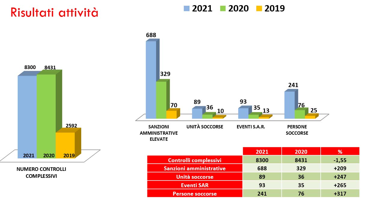 Per prevenire tali situazioni, a fronte di un andamento sostanzialmente costante dei controlli (8300 per l’anno in corso) si è avuto un significativo aumento dell’attività sanzionatoria (+109%) che è stata mirata soprattutto alla navigazione sotto costa e nelle aree vietate previo monitoraggio e raccolta di elementi di intelligence.