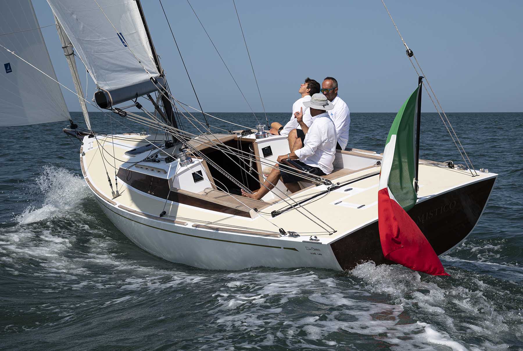 Il progettista Giovanni Ceccarelli e il costruttore De Cesari, uno degli ultimi cantieri rimasti sul territorio nazionale capaci di costruire barche di legno, hanno realizzato questo 33 piedi per l’armatore Aldo Ferruzzi, che ha commissionato il primo esemplare di questo spettacolare day cruiser al limite dei dieci metri. Una barca che ha già dato belle soddisfazioni sia in regata sia nel suo uso come unità facile da navigare in famiglia e con gli amici. De Cesari 33 ha anche posti letto per piccole crociere costiere, e forse di più: in questi gironi Golfo Mistico (questo il nome del primo esemplare) ha raggiunto Port Genesta, nei pressi di Barcellona, dove partecipa alle prove allestite per le “European Boat of The Year”, 5 categorie in tutto, premio cui collaborano le principali riviste europee. De Cesari 33, pur nella sua volontà di essere una barca classica ispirata alla tradizione, ha una carena e un piano velico moderno, frutto anche delle esperienze di Ceccarelli nella America’s Cup.