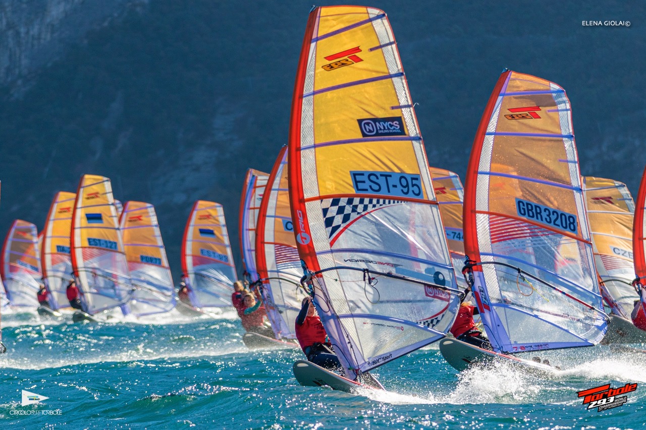 Altra mattinata intensa al Campionato del Mondo Techno 293 organizzato dal Circolo Surf Torbole, sul garda Trentino e giunto alla sua terza giornata di regate: al circolo presieduto da Armando Bronzetti l’attività è iniziata anche oggi praticamente prima dell’alba per preparare tutto, affinchè la flotta della categoria under 17 maschile e femminile potesse iniziare a regatare alle 9:00. Ancora sole e vento da nord forte, più forte di martedì con raffiche andate ben oltre i 20 nodi, hanno fatto esprimere al meglio le tavole Techno 293 con cui i regatanti hanno planato nelle tre prove disputate. Nel pomeriggio il vento da sud arrivato verso metà pomeriggio ha rimesso in moto tutta l’organizzazione gestita egregiamente da Comitato di regata FIV e posaboe (naturalmente elettriche ad ancoraggio GPS) per tornare in acqua con i più giovani under 15 e under 13 e iniziare le finali per gli under 17 maschili, che hanno regatato in gold e silver fleet, mentre le ragazze hanno proseguito con una prova di flotta.