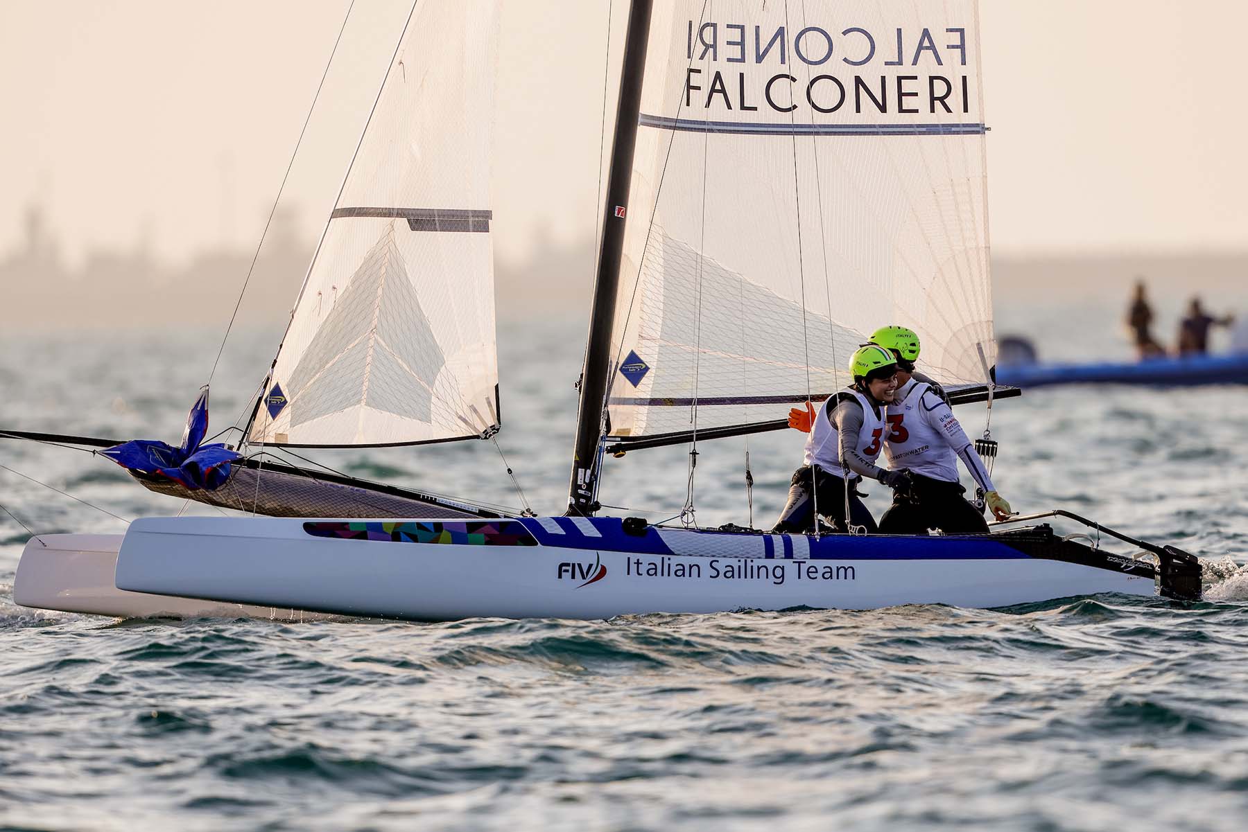 L’allenatore della squadra italiana dei Nacra 17, Gabriele Bruni, ha commentato così il risultato ottenuto in Oman: “Sono contentissimo per questo argento al Campionato del Mondo di Nacra 17 soprattutto perché viene da un equipaggio di ragazzi giovanissimi: Gigi e Maria che si sono fatti in quattro per aiutare Ruggero Tita e Caterina Banti a vincere la medaglia d’oro alle Olimpiadi di Tokyo (erano gli sparring partner dei campioni olimpici nd.r.). Ciò ha consentito a questo equipaggio di crescere e di renderli degni rappresentanti della nostra squadra di Nacra 17, che è fortissima. Questo risultato a fine anno è una cosa che mi fa un piacere immenso: sono cresciuti tanto e nel prossimo triennio olimpico saranno uno degli equipaggi da battere.”