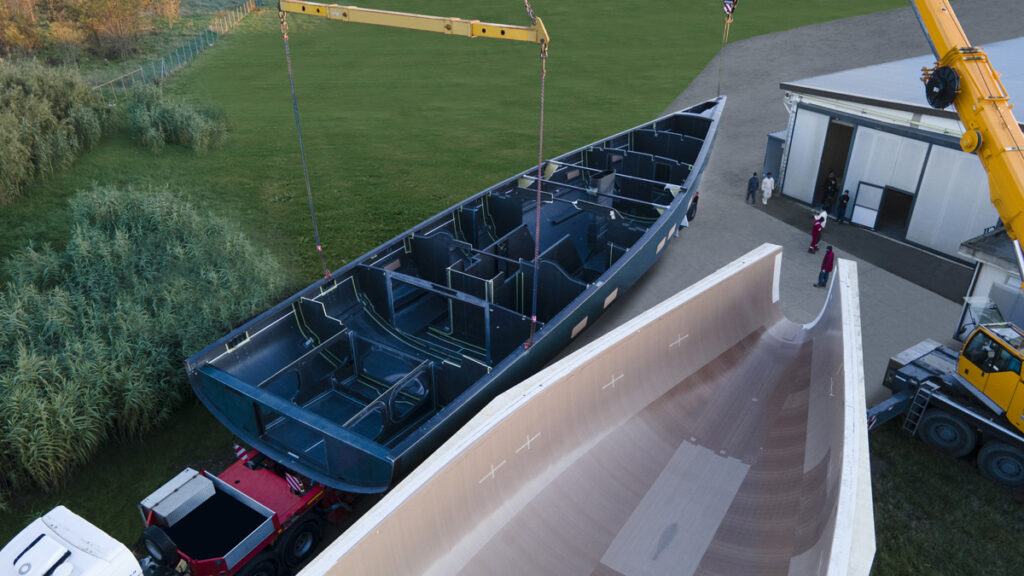 Dopo il demoulding, lo scafo è stato posato su un invaso e riposizionato al coperto per le successive fasi di lavorazione. Le maestranze stanno installando le paratie che divideranno lo spazio interno, i cablaggi elettrici, le tubature, i serbatoi e altri fondamentali impianti, mentre il ponte in carbonio è attualmente nello stampo.