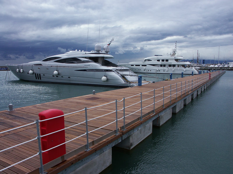 Oltre allo studio di nuovi manufatti con volumi e dislocamenti sempre più rilevanti e di componenti tecnologici innovativi, Ingemar ha investito energie e risorse anche nell’individuazione di potenziali opportunità di utilizzo dei propri sistemi galleggianti in ambiti non convenzionali. Già in passato il Gruppo si è distinto per la realizzazione di strutture ad hoc per usi speciali, quali ad esempio: aree espositive per la Biennale di Venezia e ponti temporanei per le principali celebrazioni della città lagunare, strutture di ormeggio e collegamenti per i i saloni nautici italiani, costruzioni galleggianti per circoli nautici e sportivi, sentieri e camminamenti per i bacini interni e piattaforme per uso industriale, come quelle per l’industria petrolifera in Kuwait o quella porta-elettrodi per il cavidotto che assicura i collegamenti della Grecia con l’Italia. Oggi i nuovi progetti propongono originali soluzioni tecniche e impiantistiche anche in un’ottica di ottimizzazione degli spazi e tutela degli ecosistemi, come a: Montecarlo – Principato di Monaco Completata l’installazione di un nuovo molo galleggiante destinato all’ormeggio dei mezzi navali Princess Gabrielle e Libecciu del “Department of Maritime and Airport Police” a Port Hercule. Una struttura del tutto speciale caratterizzata da 2 sezioni a larghezza diversa, una da 3m e l’altra da 2m, con un inedito piano di calpestio sopraelevato provvisto di una rampa d’accesso inclinata per agevolare l’accesso all’unità più grande. All’interno della parte sopraelevata sono ricavati vani tecnici accessibili lateralmente per l’installazione di apparecchiature di sicurezza e prevenzione.Santa Manza- Corsica Il Marina corso, già esempio di “insediamento virtuoso” con i suoi 350m di pontili Ingemar in calcestruzzo del tipo “All Concrete” che vengono rimossi durante la stagione invernale, ha modificato il proprio lay-out installando un nuovo pontile d’accesso con piano di calpestio in vetroresina a griglia, espressamente studiato e realizzato per lasciare filtrare la luce e non compromettere i locali insediamenti marini di Poseidonia.