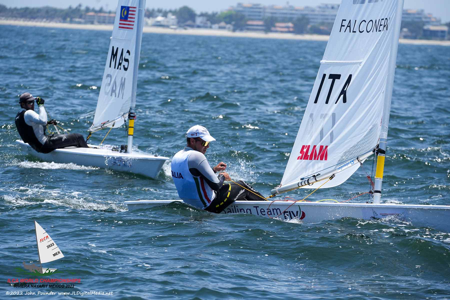 Nel secondo giorno di qualifiche la classifica nella sua parte centrale si accorcia consentendo adi migliorare la classifica a buona parte degli atleti italiani impegnati in gara. Spadoni e Chiavarini perdono invece qualche posizione rispetto a ieri ma si attestano ampiamente tra i primi trenta del Campionato Mondiale. La giornata è caratterizzata da un vento più leggero nella prima prova perché la termina entra sul campo di regata con un poì di ritardo rispetto al primo giorno, ma nella seconda prova è piena e ben distesa.