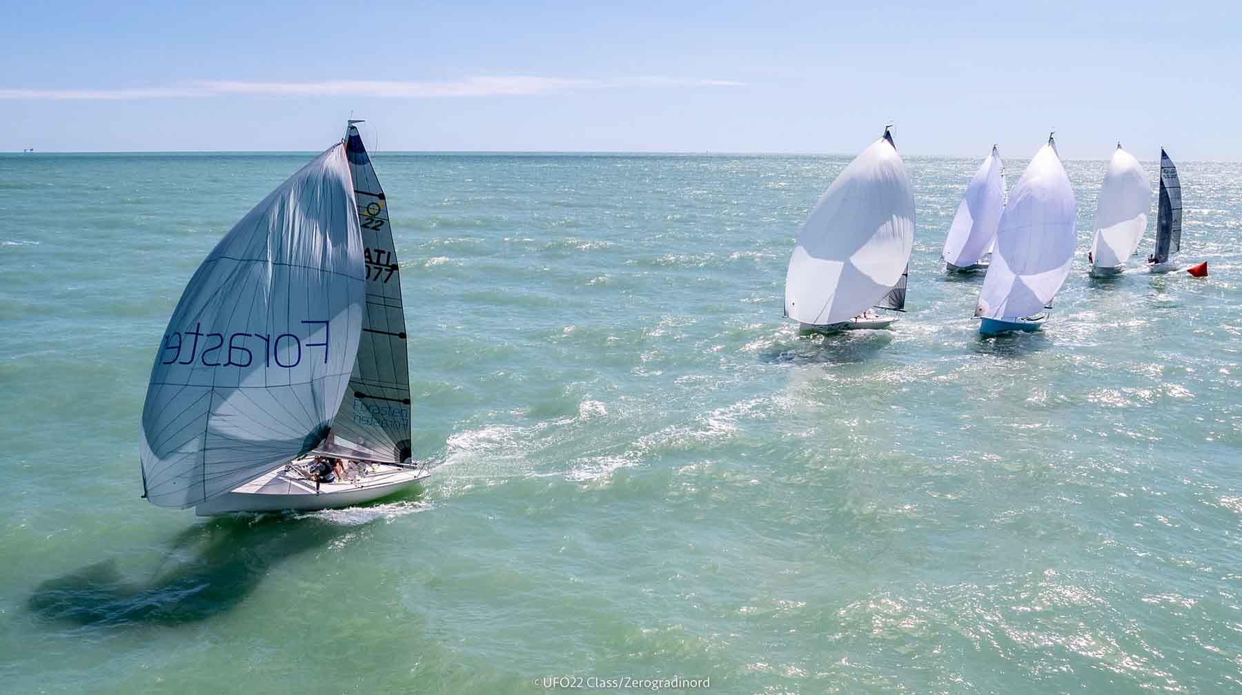 Dopo il niente di fatto di ieri, determinato dalla totale assenza di vento, l’ingresso di aria fresca da nordest ha consentito alla flotta UFO22 di mandare in archivio le prime tre prove valide per il Campionato Italiano, evento organizzato dallo Yacht Club Rimini e ospitato presso le banchine del Marina di Rimini.