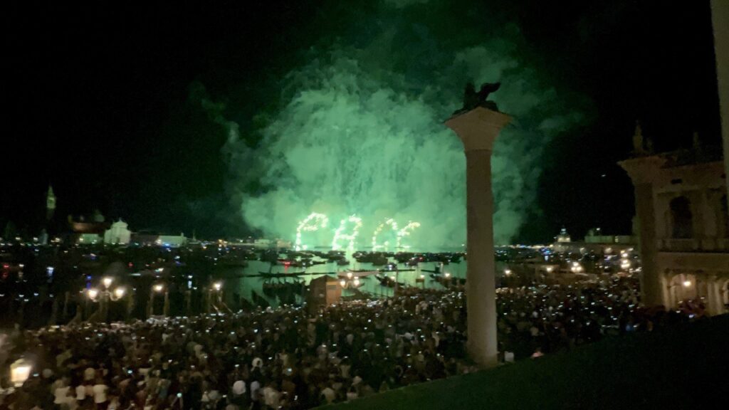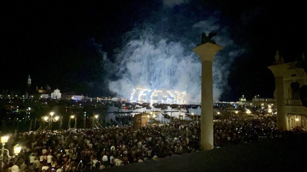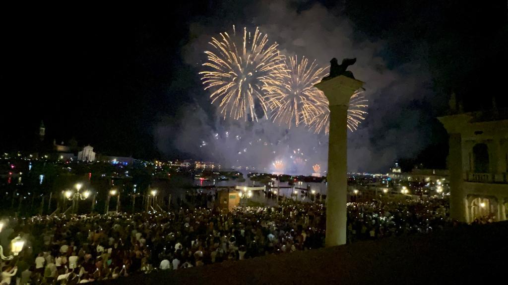 Il gemellaggio di Venezia con la città ucraina di Odessa e un inno alla pace. Questo il tema dei fuochi d’artificio proposto dal Redentore 2022 dal titolo “Incanto: i colori della bellezza” che ha preso il via alle 23.30 davanti ad un pubblico di circa 70mila persone: tra questi 28mila gli spettatori che hanno ammirato i “foghi” da una delle 3600 barche presenti in Bacino San Marco, 42.000, invece, quelle che si sono assicurate un posto tramite la prenotazione per assistere ai fuochi da Zattere, Piazzetta San Marco e Riva degli Schiavoni, oltre che dall’isola della Giudecca.