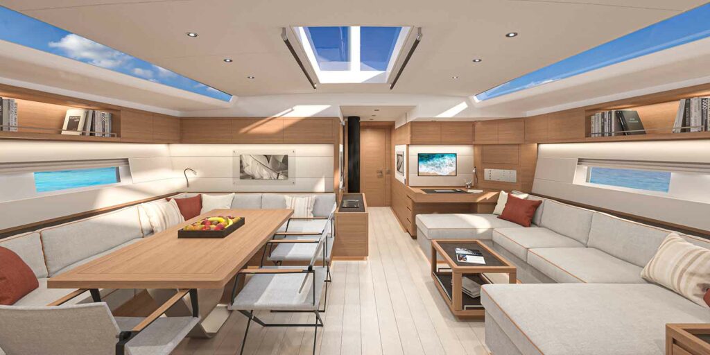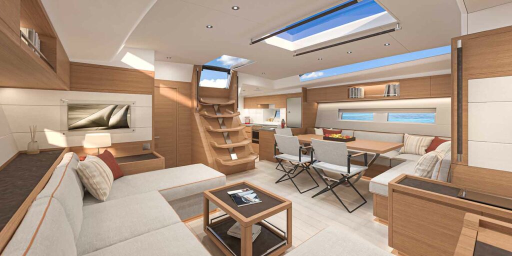 Per gli amanti dei tecnicismi, le forme di carena del nuovo Grand Soleil 72 progettate da Matteo Polli sono caratterizzate da una V pronunciata a prua. L’importante lunghezza dinamica grazie agli slanci e alla bassa superficie bagnata permette di smagrire la poppa per una riduzione degli attriti dell’opera viva in navigazione. Questo infatti permette una maggiore velocità dinamica e stabilità a barca sbandata, traducendosi non solo in maggiori performance in condizioni di vento leggero, tipico dell’area Mediterranea, ma anche in un’ottima facilità e sicurezza di navigazione.