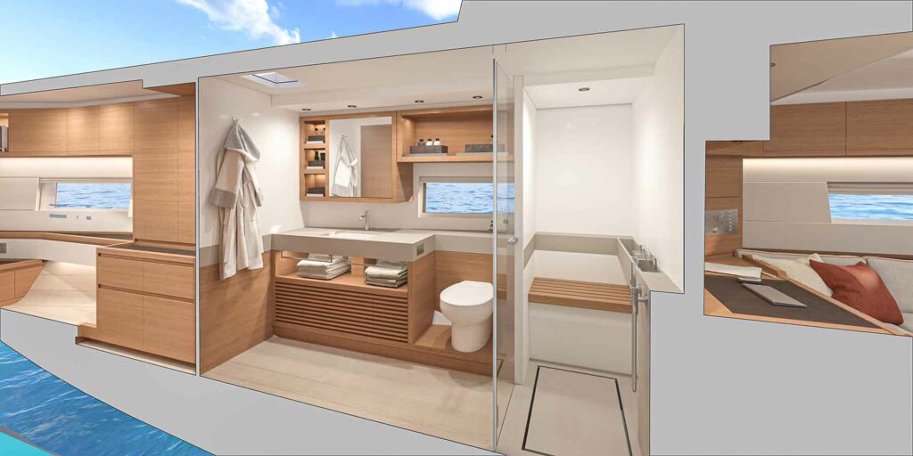 L’artigianato e l’esperienza del Cantiere maturata in 50 anni di storia non si limita solamente alle linee estetiche, ma anche alla cura e al dettaglio tecnico-performante di tutte quelle zone dove l’occhio non arriva. Primo tra tanti, tutte le paratie in composito per la realizzazione degli interni vengono pesate una ad una definendo ad hoc lo spessore di ciascuna per ottimizzarne robustezza, leggerezza e prestazioni.