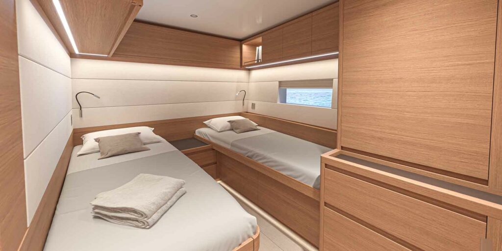 Il layout degli interni, secondo la consueta e apprezzata firma di Nauta Design, è in perfetta relazione con le geometrie della coperta. Nauta ha concepito, disegnato e affinato ogni volume e dettaglio di coperta e interni per sfruttare tutti gli spazi, ottenendo così tra loro una relazione coerente e olistica. Negli interni dimensioni, ergonomie, stivaggi, funzioni e qualità di tutti gli accessori sono settate su standard da super yacht. Il design e le varie palette dei materiali connotano gli interni dallo stile sobrio, fresco, elegante ed accogliente.